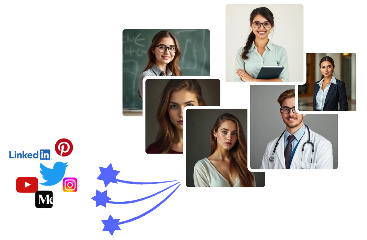 Create captivating and personalized avatars that perfectly reflect your personality. Elevate your social media presence with our cutting-edge AI portrait generator. Perfect for Instagram, LinkedIn, TikTok, and other social media platforms, our AI tool is the ultimate solution for attracting more followers and increasing likes, retweets, and shares.